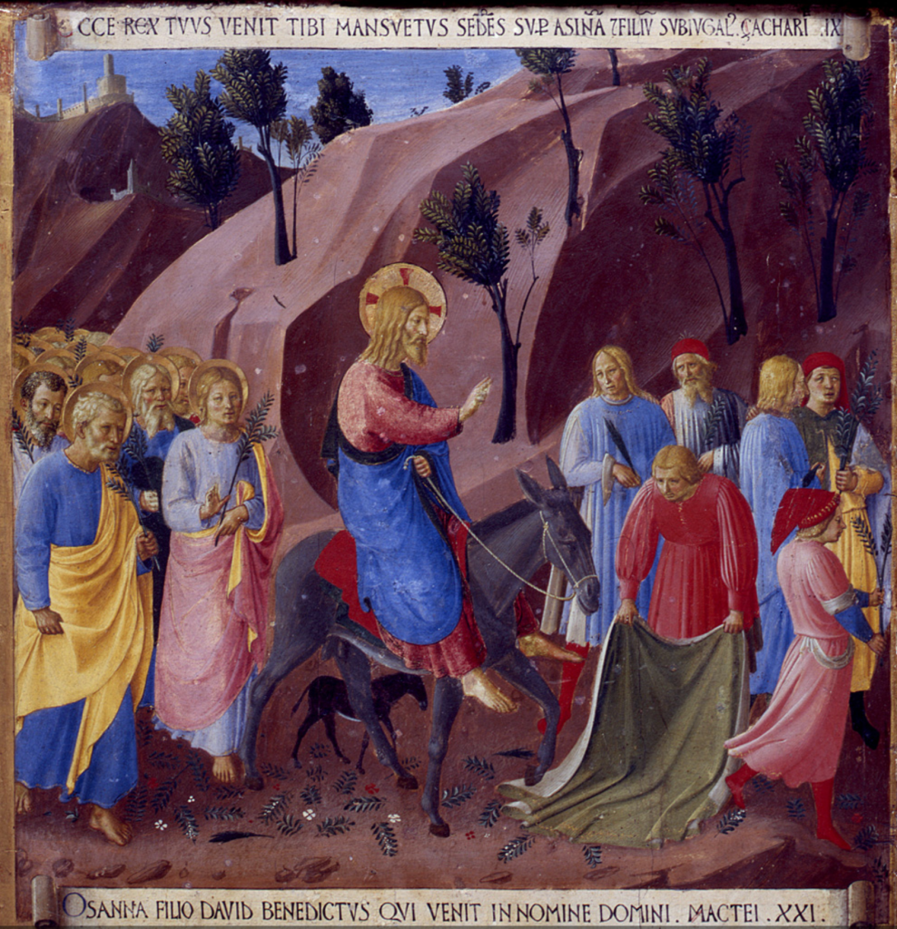 La Domenica delle Palme apre solennemente la Settimana Santa. Il colore liturgico è rosso, segno della Passione di Cristo. La celebrazione inizia con la benedizione dei rami di palma o di ulivo e la proclamazione del Vangelo dell’ingresso di Gesù a Gerusalemme. Segue la processione verso la chiesa mentre il popolo acclama: «Osanna! Benedetto colui che viene nel nome del Signore!». Durante la Messa viene proclamato il racconto della Passione. La liturgia passa così dall’entusiasmo delle palme al dramma della croce, introducendoci così nei giorni santi.