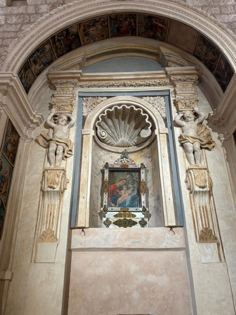 Here your gaze meets an 18th-century painting attributed to Orazio Morotti (1660–1723). On the wall is a canvas depicting the Virgin Mary above a radiant halo, surrounded by groups of cherubs. With her left hand, the Madonna lifts her mantle to protect a small child clinging to the belt fastened around her waist.