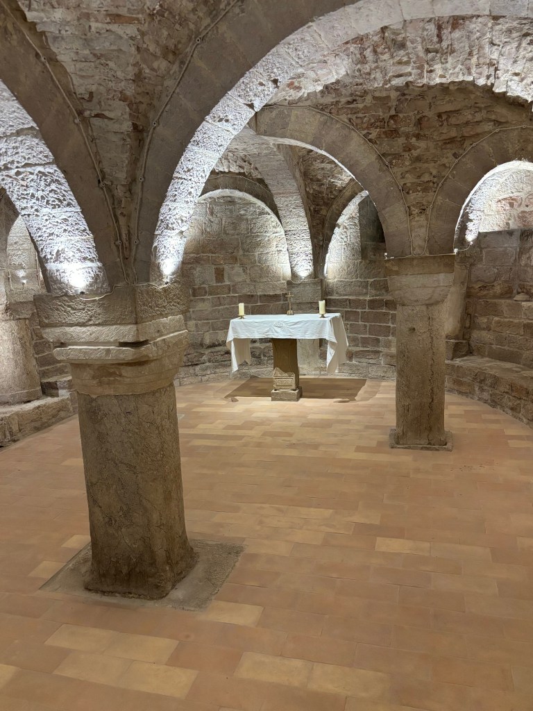 A significant element, as in the church above, is the presence of a single east-facing window. The morning light enters the crypt in a measured way, enhancing the architectural structure and emphasizing its symbolic dimension. In 2024, the crypt was reopened to the public after a restoration that restored its original layout, clarified the spatial organization, consolidated the structures, and brought to light its medieval configuration. Today it is once again accessible as an integral part of the church’s visitor path.